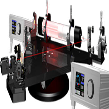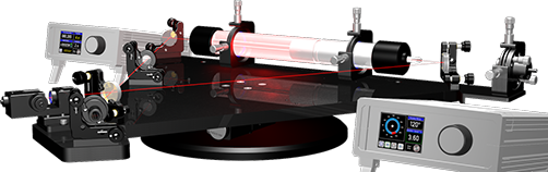 However the difference of such a ring laser gyroscope to the idea of Sagnac lies in the fact that within Sagnac’s set-up the light source is separate from the ring structure and the signal is as a phase shift between the counter propagating beams. In the laser gyroscope discussed and applied here, the light source is part of the ring laser and the output is a beat frequency between the counter propagating laser modes. This class of laser gyroscopes are termed as “active” and those of the Sagnac’ s type as “passive” laser gyroscopes. In general the active laser gyroscope provides a much higher precision and long term stability as against the passive ones. The precision of the laser gyro becomes more evident, when it is compared to other well known measuring devices for instance a micrometer screw with a resolution of 0.01 mm. It must have at least a length of at least 3 km (!) for having the same resolution. Within this experimental system the basics of the laser gyro are explained and practically studied at the system, which allows full access to all components. The experimental laser gyroscope consists of a rugged turntable on which the ring laser is mounted. A rotational stage driven by a stepper motor which rotates the turntable. The angular speed and range can be set via the provided controller. The ring laser consists of three laser mirrors arranged at the corners of an equilateral triangle. The point of rotation lies well within the centre of this triangle. At one mirror a beam bending device is positioned in such a way that the clockwise and counter clockwise propagating modes are superimposed and their beat frequency is detected by means of two photo detectors. The signal of the photodetector has a phase shift of 90° to each other so that a subsequent direction discrimination is performed. The created TTL signal is fed to a frequency counter. For the first alignment of the ring laser an adjustable green laser pointer is used. Once the system is aligned, the single mode etalon is inserted to obtain the required single mode operation. The beat frequency of the modes is measured as function of the angular speed. A special measurement is focused on the so called lock-in threshold, which is an unwanted effect of active laser gyroscopes.