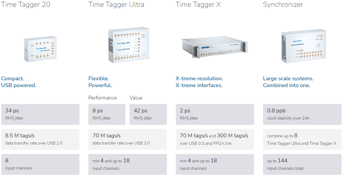 - supports SPADs, PMTs, SNSPDs, SiPMs