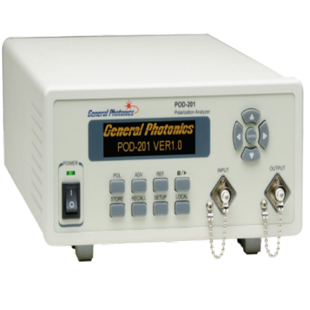 The POD-201 is an in-line fiber-coupled polarimeter that simultaneously measures the four Stokes parameters to yield the instantaneous state of polarization (SOP) and degree of polarization (DOP) of input light.