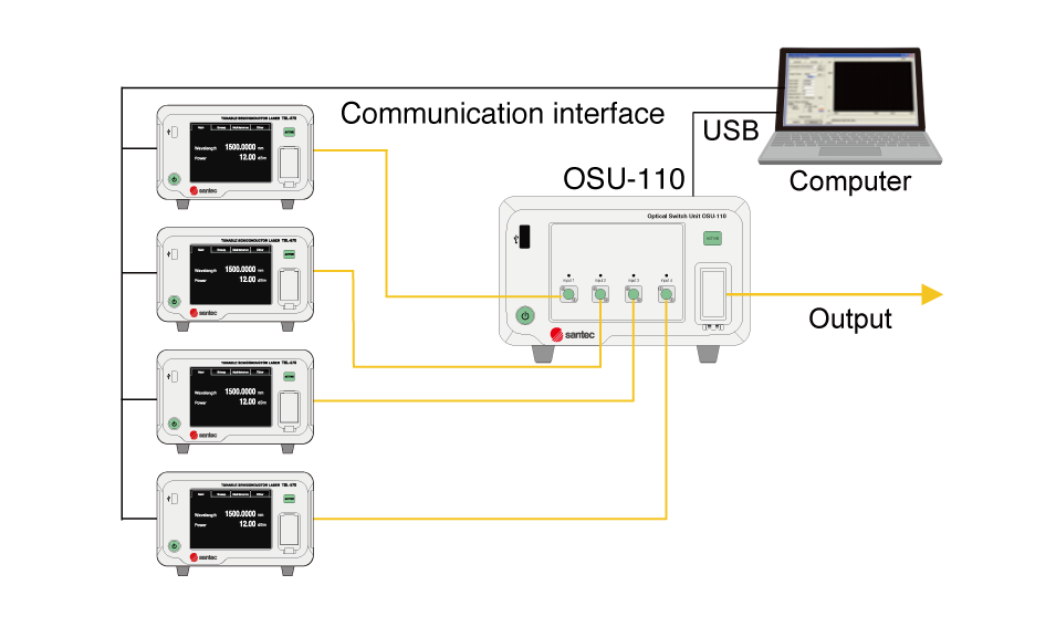 The system combines up to four of our tunable lasers (TSL-570) with an optical switch module (OSU-110) and control software.